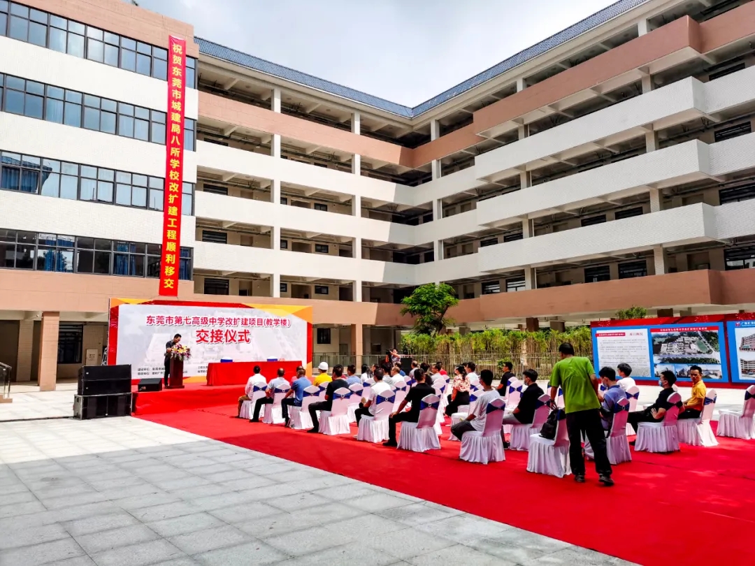 這是匯華建設助力東莞市教育擴容提質千日攻堅行動的又一學校項目。在此次移交儀式上,東莞市城建局領導馬文標、東莞市第七高級中學校長段文宏、施工單位匯華集團董事長麥照華先后發表致辭,對東莞市第七高級中學改擴建項目(教學樓)的順利移交表示祝賀。